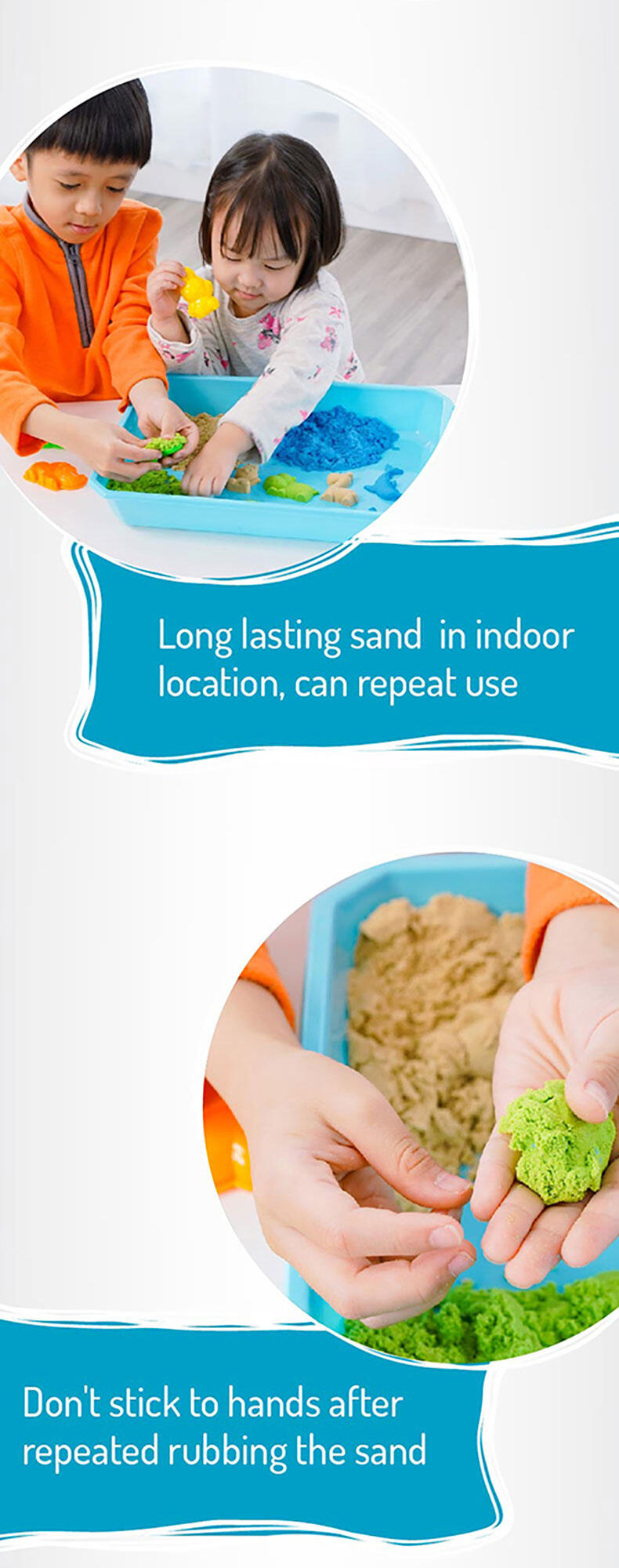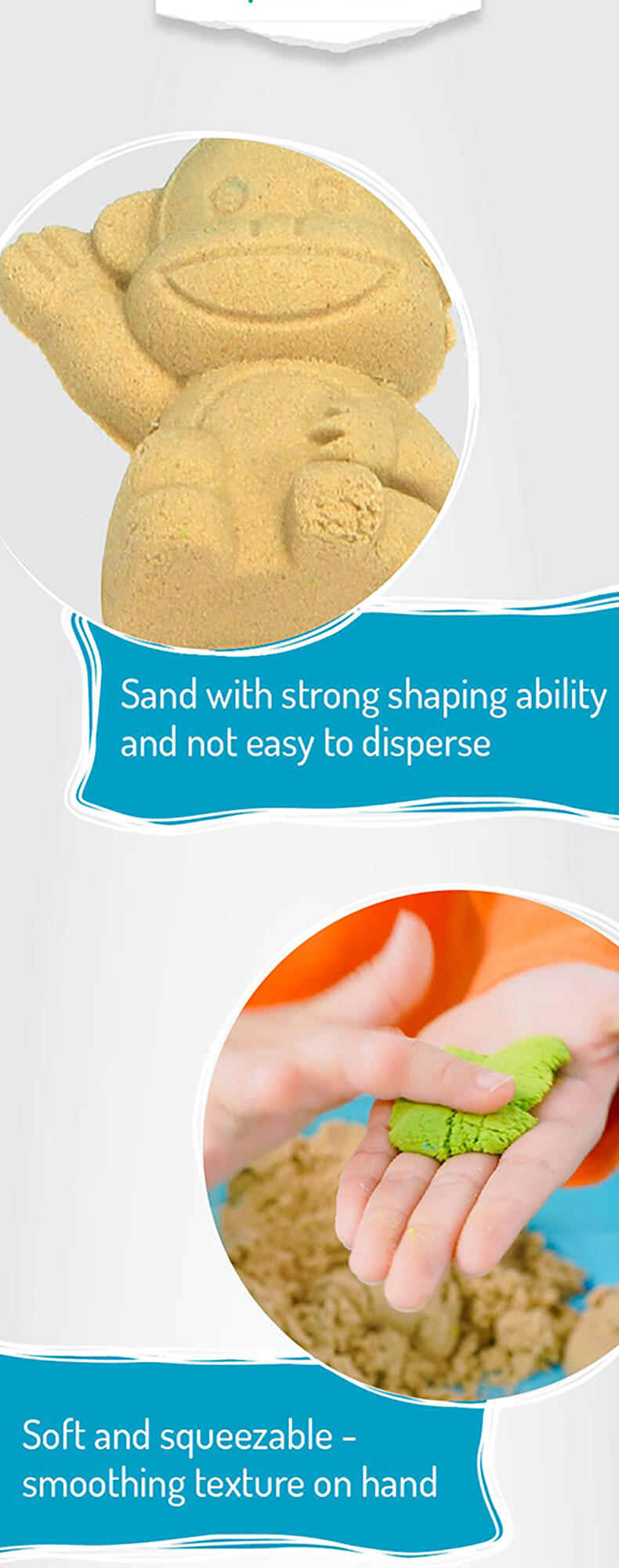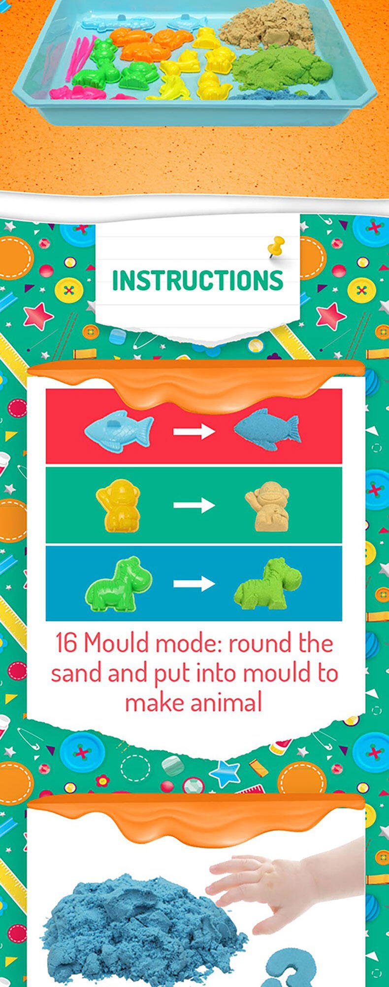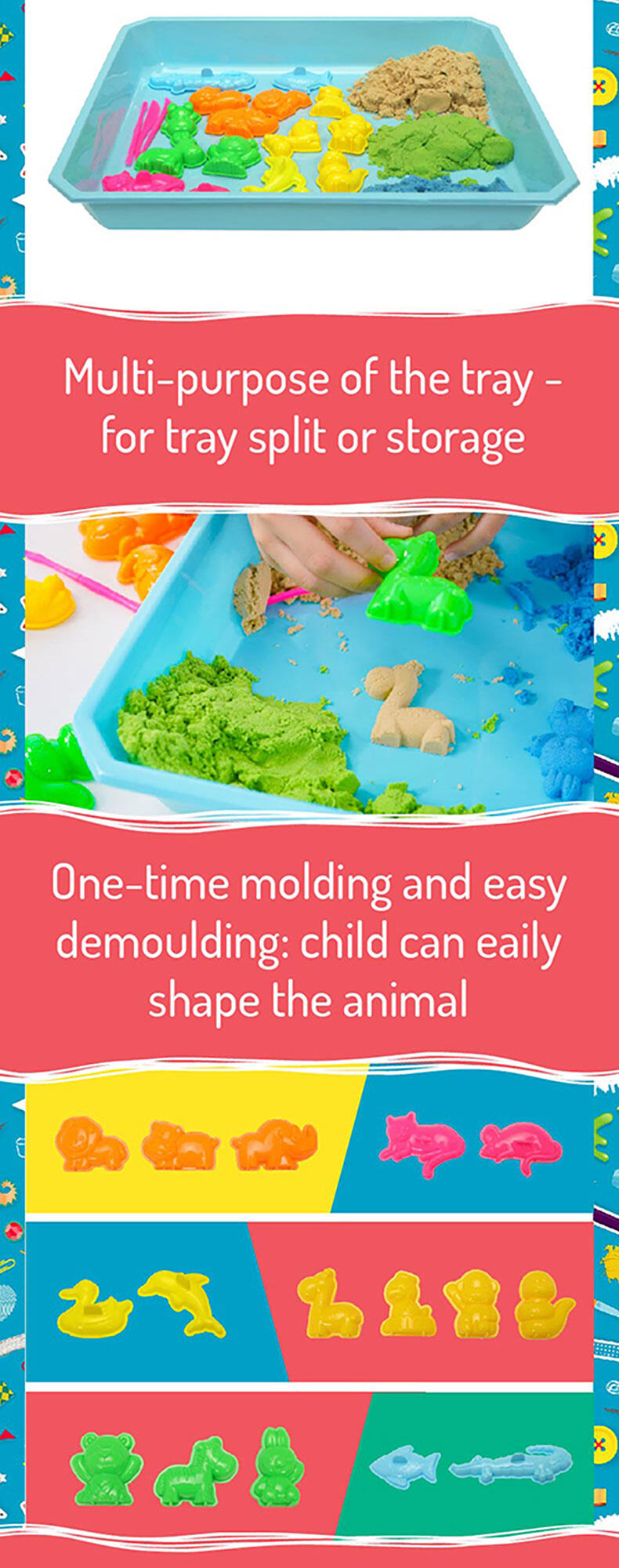 The craziest animal farm is awaiting their masters! Unleash the young artists' imagination with the fantastic Creation Sand. By moulding their green dolphin, brown giraffe or blue monkey and showing them off to others on the cute carrying tray, their hand-eye coordination, communication, and social skills are developed.