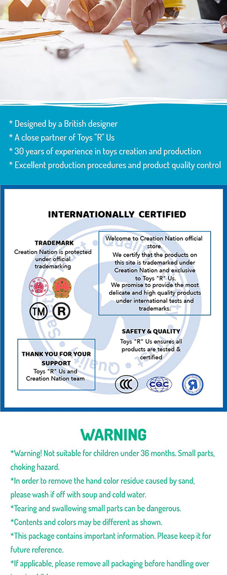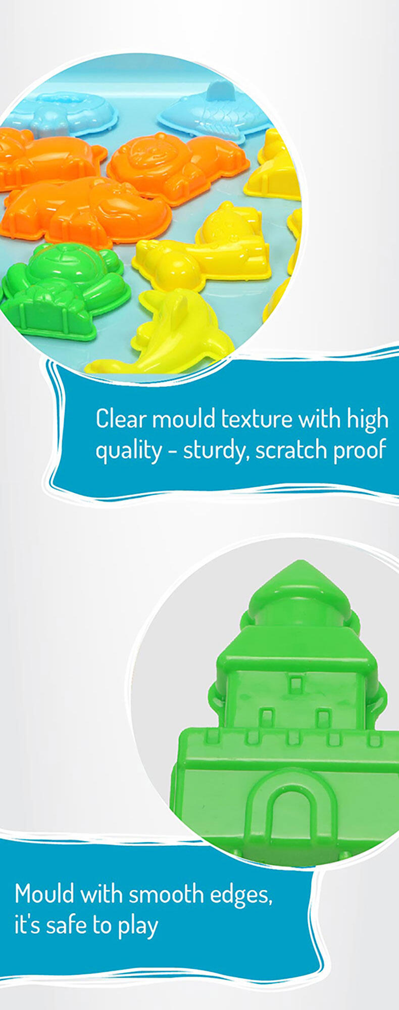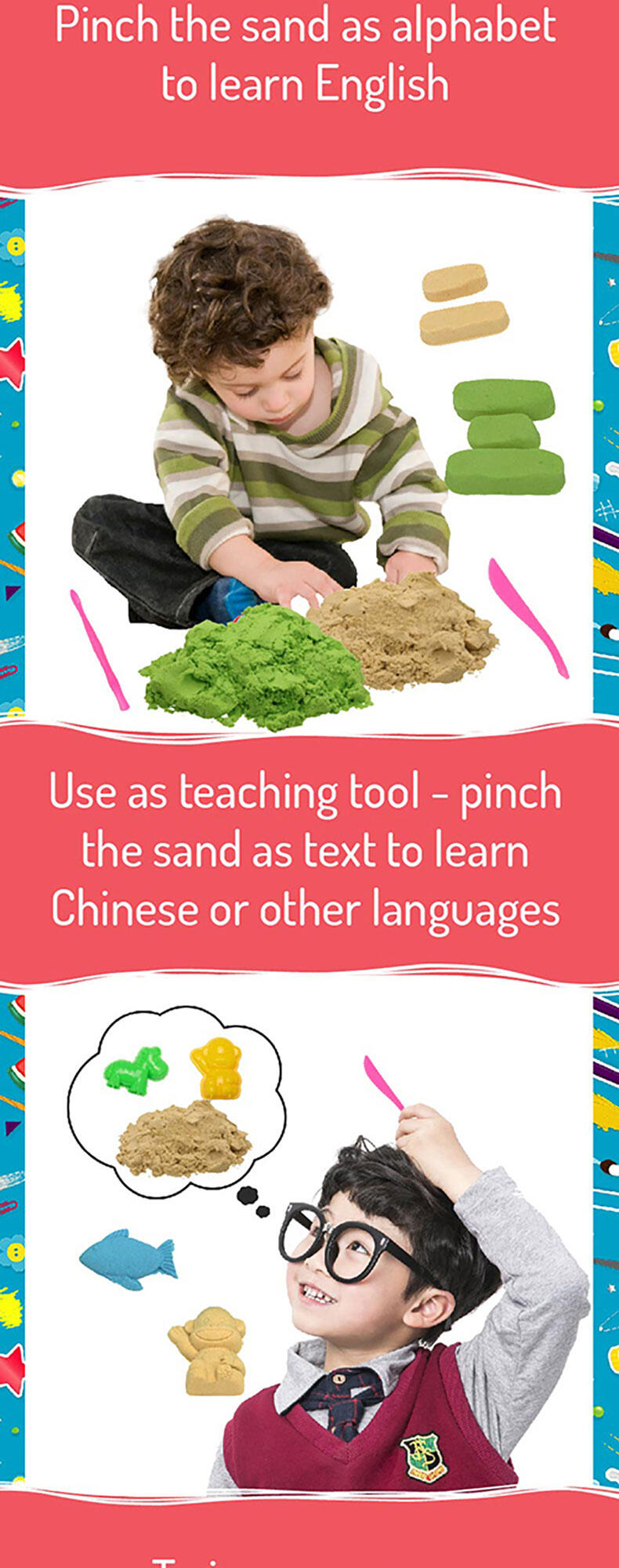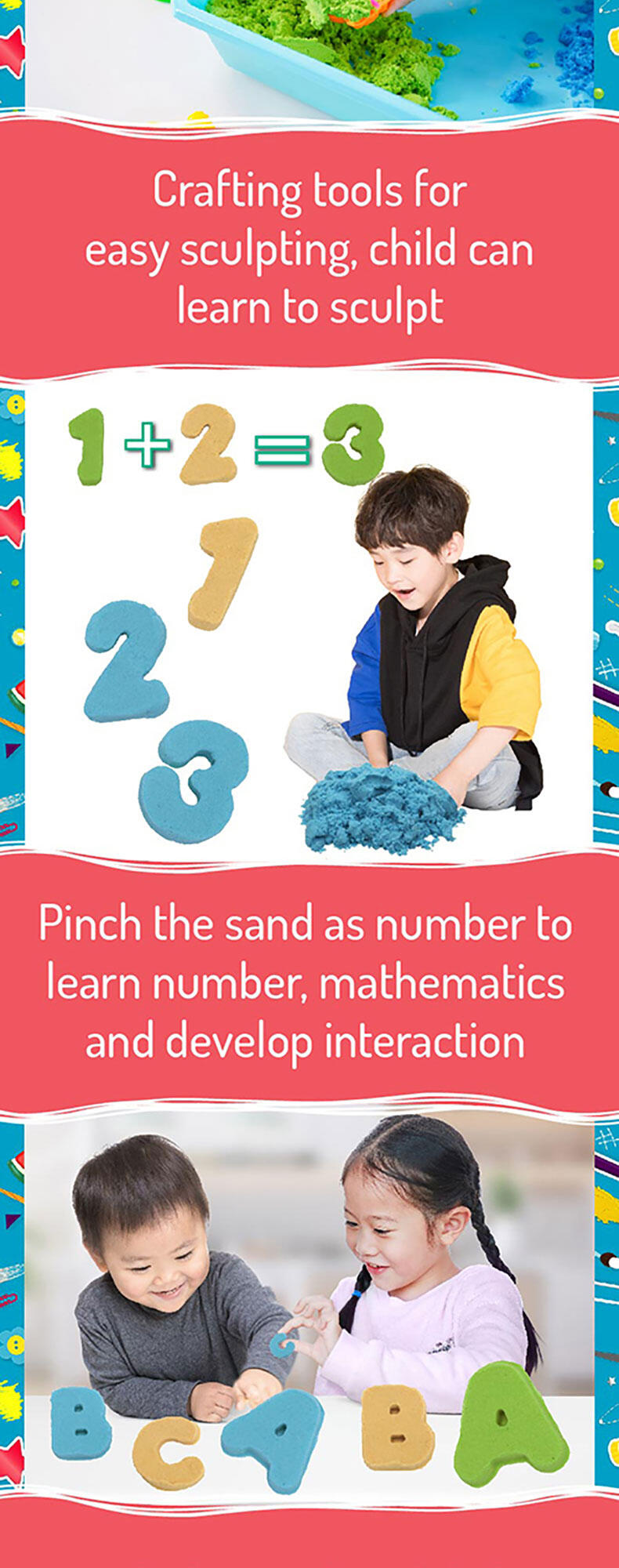 The craziest animal farm is awaiting their masters! Unleash the young artists' imagination with the fantastic Creation Sand. By moulding their green dolphin, brown giraffe or blue monkey and showing them off to others on the cute carrying tray, their hand-eye coordination, communication, and social skills are developed.