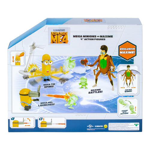 - Mega Minions VS Maxime 4" Action Figures Pack includes Mega Minions Tim and Mega Minion Mel and Maxime action figures.