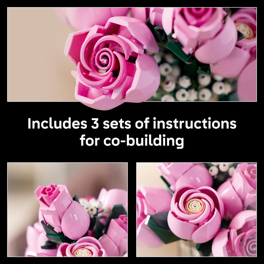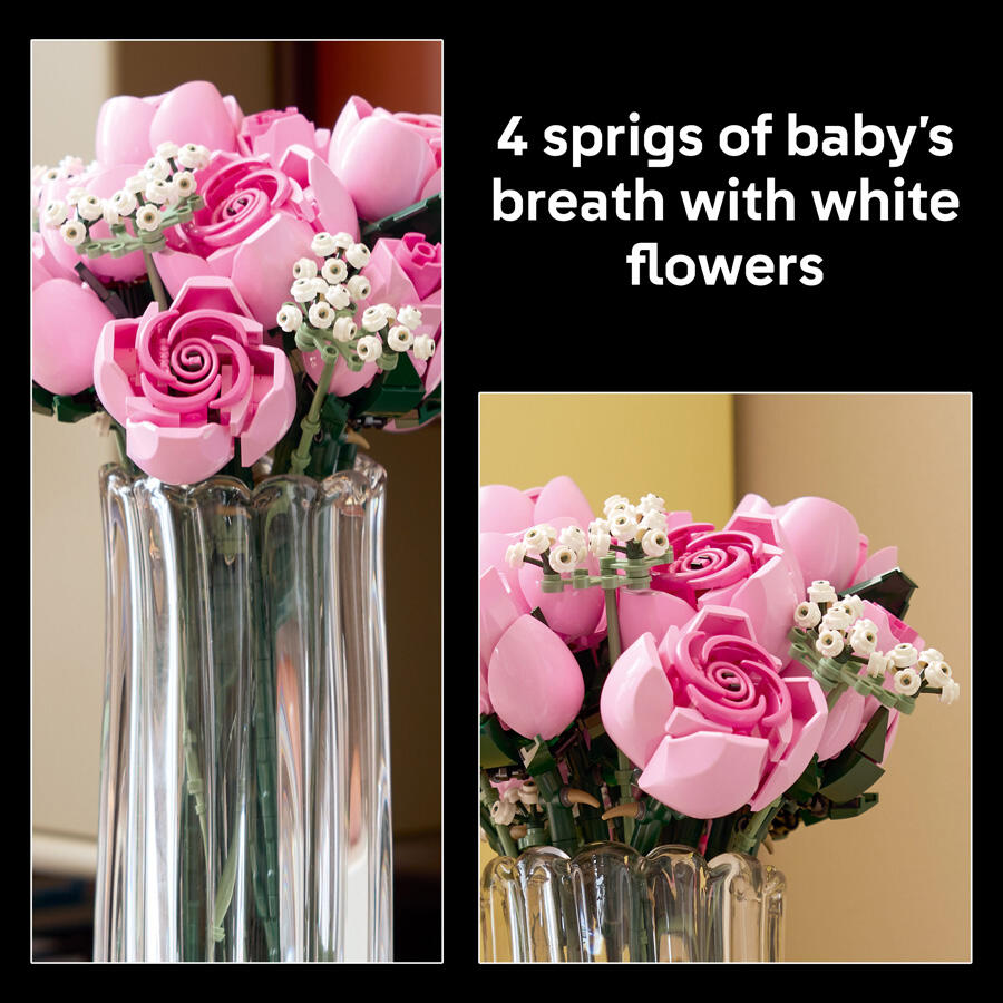 - Create an elegant brick-built flower arrangement and marvel at its rosy details with this LEGO® Botanicals Bouquet of Pink Roses (10374) building set for adults. Enjoy an immersive project as you meticulously craft the LEGO bouquet, which features 12 pink roses at various stages – discover 4 roses in full bloom, 4 blossoming roses and 4 rosebuds. The roses are shaded with pink gradients for added authenticity, and the bouquet also features 4 charming sprigs of baby’s breath with small white flowers. Ideal as a solo or group project, the set includes 3 sets of building instructions that let you bond over blooms with friends or family before displaying the roses proudly as floral decor. Flowers are the perfect gift for any occasion, so give this flower building kit as a Mother’s Day gift, Valentine’s Day gift or birthday gift for women, men and flower fans, who will be delighted to build a bouquet that lasts forever. Set contains 789 pieces.