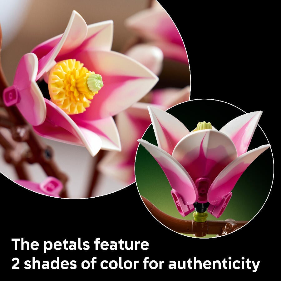 - Immerse yourself in nature and create beautiful flower decor with this LEGO Botanicals Magnolia Branches (11510) building set for adults. Relax as you craft the floral display, which includes 5 highly detailed magnolia branches. This is one of the only LEGO Botanicals sets to include branches and the magnolia petals feature 2 shades of color for added realism. There are also lots of fun details to discover, including cupcake pieces for the flower carpels, brown frogs as wood knots, egg pieces for the buds and ice cream swirls for the furled bud tips. Once built, the LEGO flowers become gorgeous floral decor and can be combined with other LEGO Botanicals sets (sold separately) to create a larger and customized display. This building kit makes a thoughtful birthday, Valentine’s Day, Mother’s Day or housewarming gift for women, men and nature lovers. It’s also available in the LEGO Builder app, where budding florists can rotate their build and track their progress. Set contains 435 pieces.