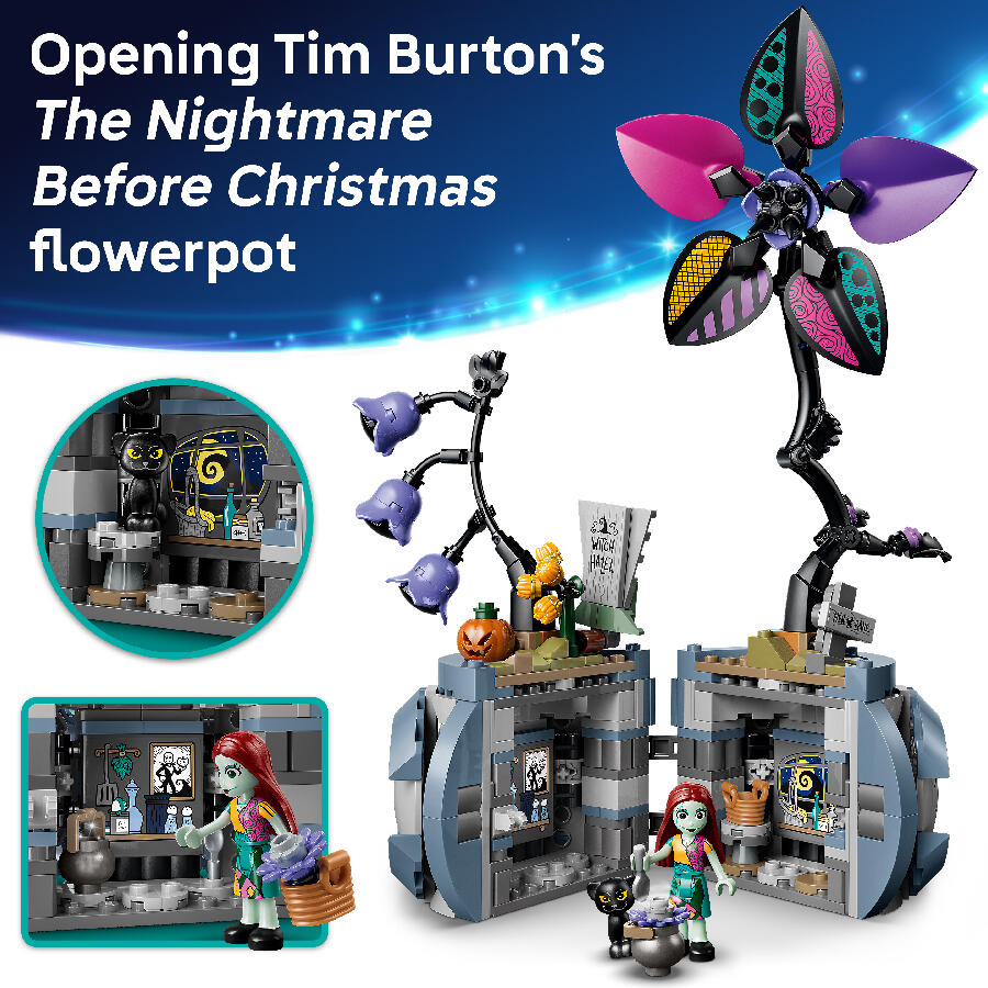 - Surprises await kids ages 9 years old and up in this LEGO ǀ Disney Sally’s Flowerpot (43288) building toy. This flower building set, inspired by Tim Burton’s The Nightmare Before Christmas, sparks play with 2 LEGO ǀ Disney characters: Sally and a little black cat. There’s a flowerpot with 2 brick-built flowers, hidden rooms and graphic stickers inside and out. The interior space also includes a basket, cauldron, buildable table and much more. The characters can fit inside for storage after play. This building toy for girls or boys 9 years old and up makes a cool floral gift-giving idea for a birthday or holiday. Display this flowerpot alongside other LEGO ǀ Disney building toys (sold separately) to show off a collection. Fulfill a child’s love for imaginative play with a build that also offers fun play options. Kids can build with confidence using the LEGO Builder app – zoom, rotate in 3D and track progress with easy-to-follow digital instructions. Set contains 346 pieces.