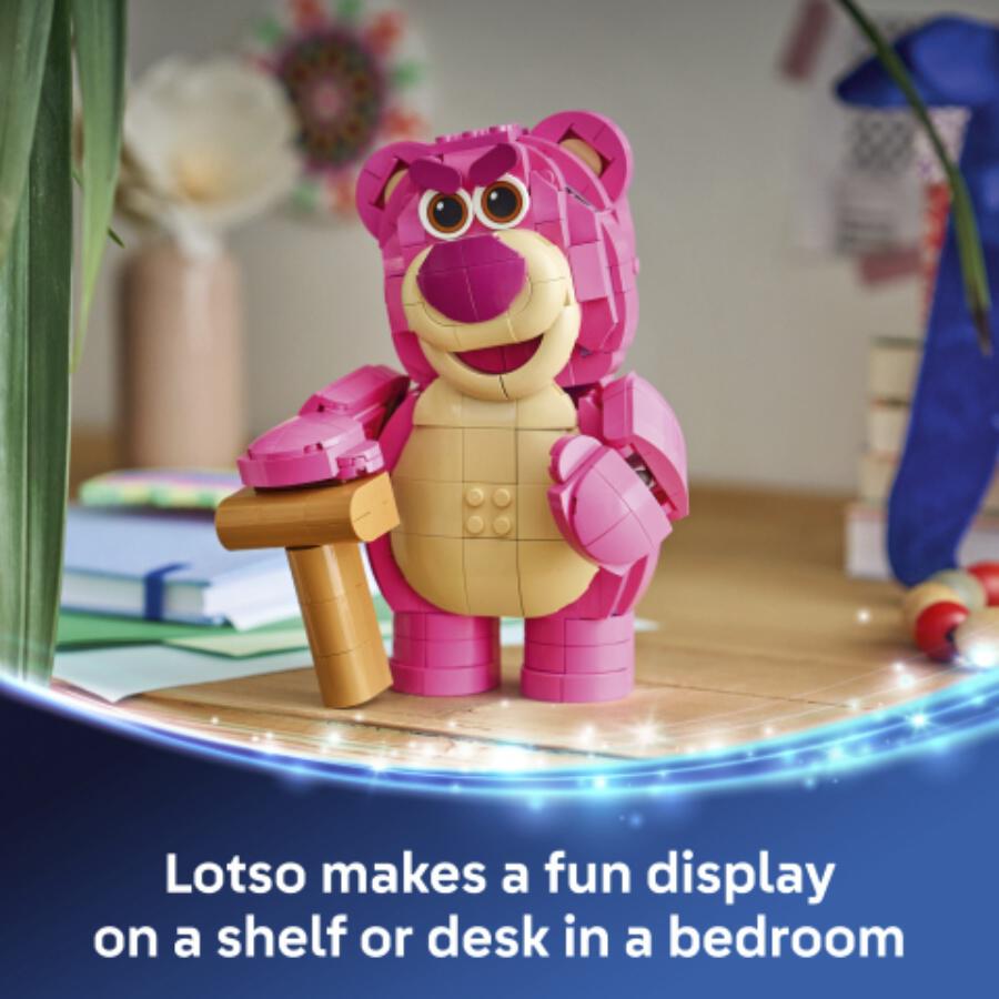- Exciting stories are waiting for movie fans with this LEGO® ǀ Disney and Pixar Toy Story Lotso (43306) model building kit. This buildable set for kids, inspired by the Toy Story universe, is fun for girls and boys ages 9 years old and up, encouraging creative play or cool display. It includes a brick-built pink-and-white Lotso the bear character with a movable face, arms, legs and hands, and a walking stick. Lotso can stand or sit and has hidden Easter eggs to discover. This Lotso gift-giving idea is a great choice for girls, boys and any Toy Story fan. The Disney building toy can expand a current collection or start one with a well-known character. And as kids build, they can collect all their sets in one place: the LEGO Builder app lets kids save their sets, zoom, rotate in 3D and track their building progress with ease. Set contains 570 pieces.