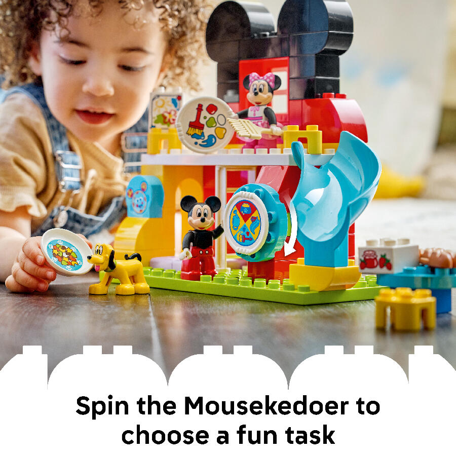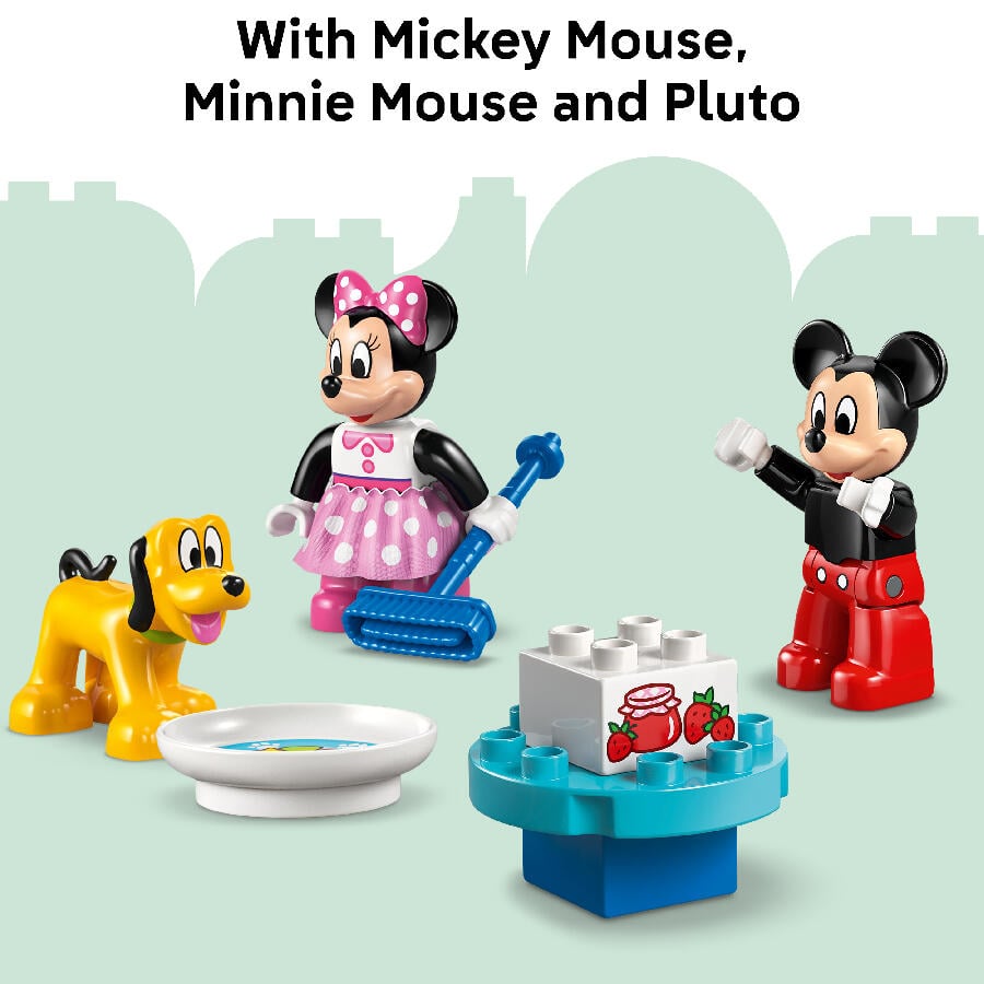 - Toddlers ages 2 and up join favorite Disney characters completing fun tasks with the Mickey Mouse Clubhouse with Minnie & Pluto (10465) building toy. This building playset has a 2-level house with a slide, art room, garden with a bug hotel, tables and chairs, and a special door for Pluto. It includes LEGO ǀ Disney characters Mickey Mouse, Minnie Mouse and Pluto, as well as a Toodles the computer decorated brick. To kick start the play, toddlers spin the Mousekedoer to decide if the characters should feed Pluto, dig the garden, paint a picture or play on the slide. Or they can enjoy open-ended play exploring this building set’s features. They can imagine growing strawberries or making jam for breakfast. This Disney building toy can help them practice their fine motor skills as they place the tools in the characters’ hands. This educational building toy for toddlers can help young boys and girls to care for others as they feed Pluto or make breakfast for their friends. Contains 87 pieces.