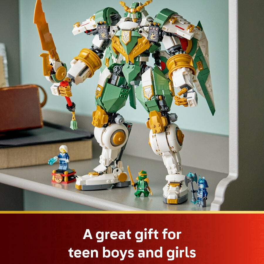 - Teen boys, teen girls and nostalgic ninja fans ages 14 and up can celebrate the 15th anniversary of the LEGO NINJAGO TV show with this highly impressive and feature-packed mech toy. The LEGO NINJAGO Lloyd’s Titan Mech 15th Anniversary (71860) action figure set is an upgraded version of the fan favorite original Lloyd’s Titan Mech (70676) model. This mech toy features several posable body parts including wings, legs, feet, arms and shoulders and a cockpit for a minifigure. It also comes armed with a large sword and, for the first time ever, a large shield that can be repurposed and placed on the back as a pair of wings. The model building kit comes with 3 minifigure characters, Lloyd and Grimfax from the TV show, plus a collectible elemental Master of Ice on a stand. Ninja fans can build the playset with confidence using the LEGO Builder app – zoom, rotate in 3D and track progress with easy-to-follow digital instructions. Building set contains 1,293 pieces.
