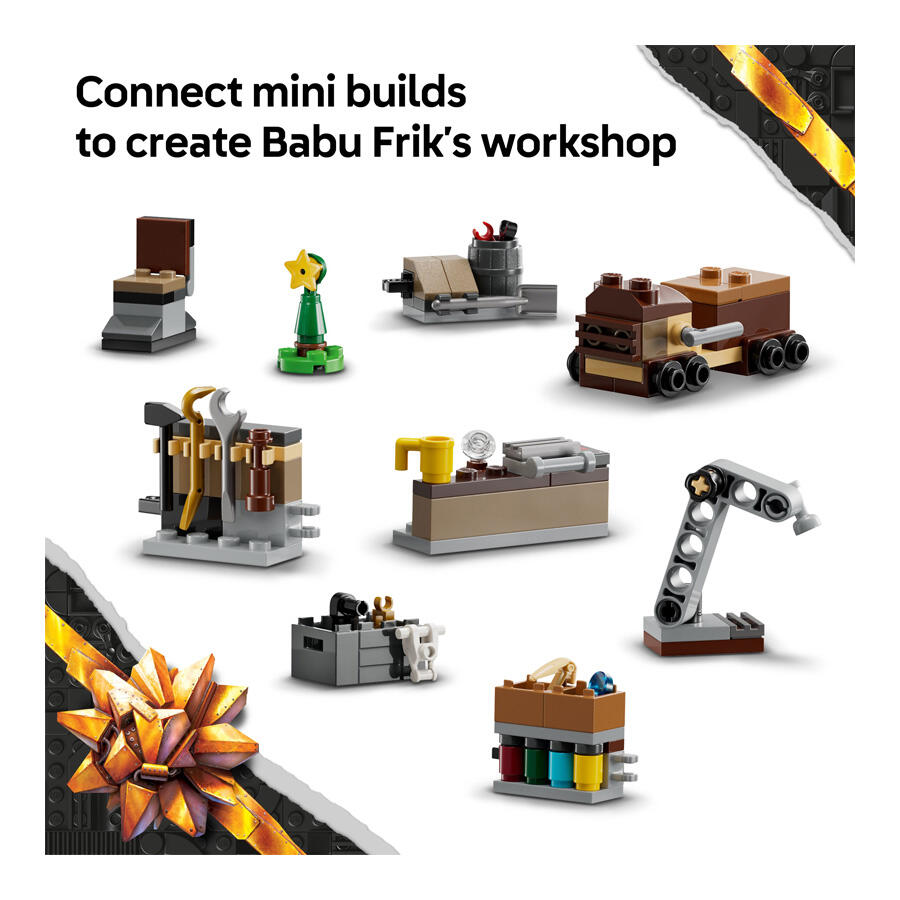 An Advent calendar packed with Star Wars™ Christmas gifts, including LEGO® droid figures and mini build toys, for kids to create a Babu Frik workshop.