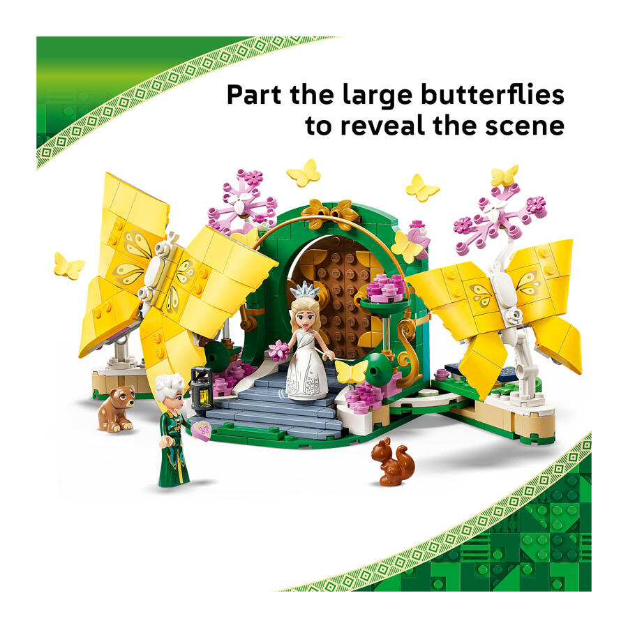 - Open up a world of creative activities with LEGO® Wicked Glinda’s Wedding Day (75688) role-play toy for kids aged 8 plus. Girls, boys and fans of Wicked merchandise build this beautiful set then play out the dramatic scene from Wicked: For Good, where Glinda prepares to marry Fiyero. Kids pull apart the giant posable LEGO butterfly building toys to reveal the wedding scene. This fantasy gift packed with recognizable details from the movie, including the wedding cake, is a heart-shaped invitation and Glinda’s bouquet from Fiyero. For authentic role play Glinda wears the gown and tiara from the movie, and has a changeable face as her day flips from delight to disaster when the included animal figures rampage through the scene. When the play is over, kids close the Wicked-themed gift by drawing the butterflies together and display this eye-catching set in their room. This building toy can be used with other LEGO Wicked sets so the movie adventures never end. Set contains 476 pieces.