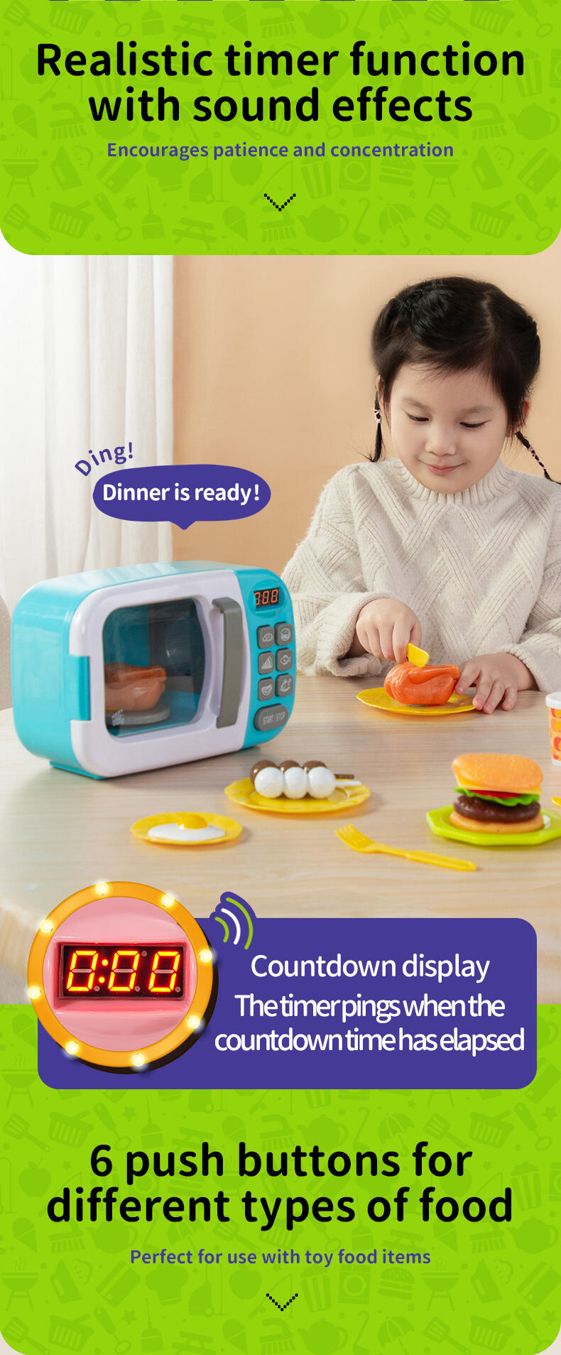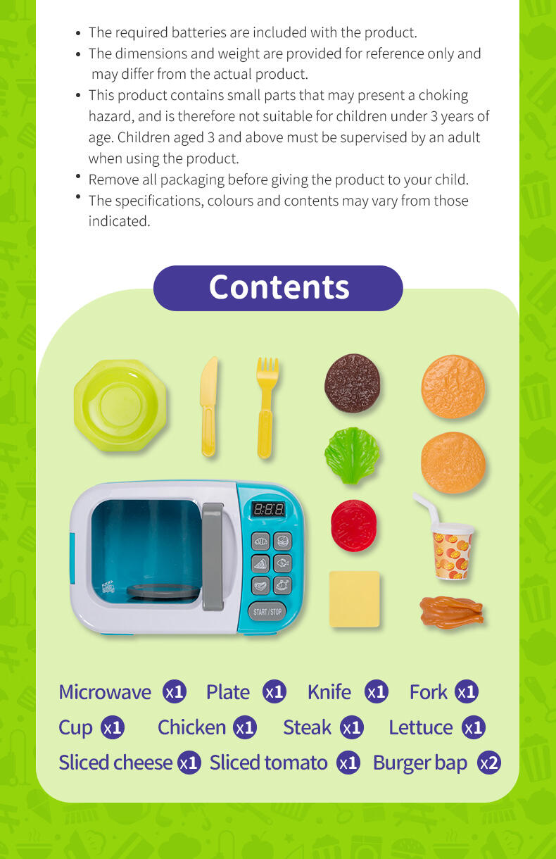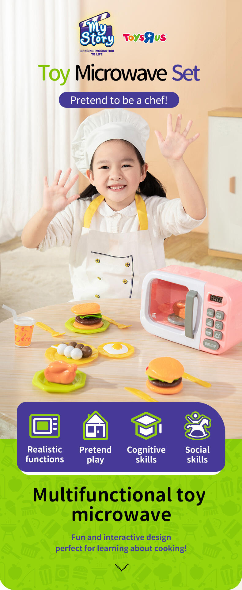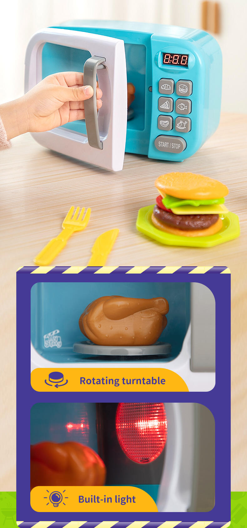The Mini Microwave has realistic lights and sounds that work just like the real thing! There are buttons to press, a cooking plate that spins, and a light that activates when the microwave is in use. Accessories like food and utensils ensure that the play experience feels just like the real thing as kids cook and prep delicious meals for friends and family. The interactive and authentic functionalities of this toy creates a positive and open experience that ensure little ones build confidence through play.
