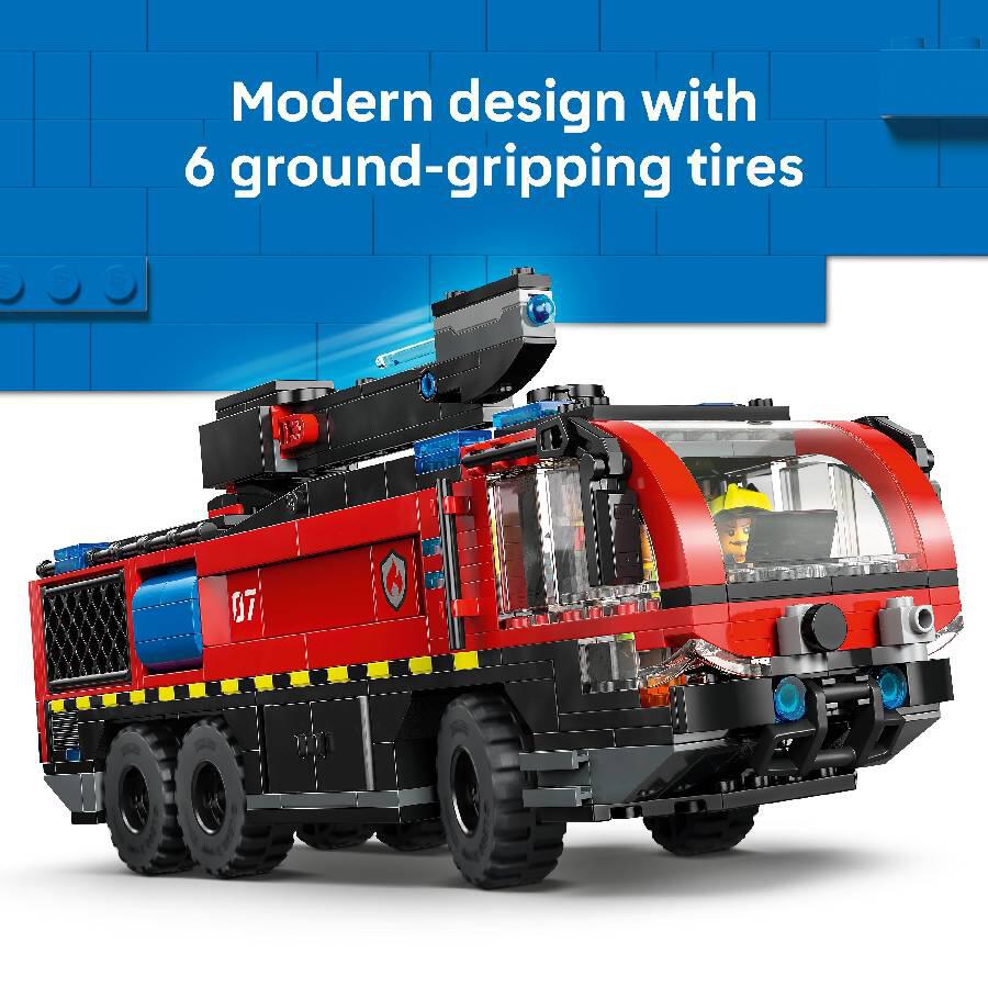 Mobilize the LEGO® City Airport Fire Truck (60499) for kids ages 7 and up. This realistic emergency vehicle toy features a 360° rooftop extinguisher, opening side equipment bays and tool storage compartments. Kids can turn a dial to steer the truck, launch water elements from the extinguisher and remove the engine for repairs. The toy truck comes with 6 chunky rubber tires and a detailed cab with seating for the 4 firefighter minifigures. Just add a sprinkle of imagination to ignite hours of heroic firefighting adventures.