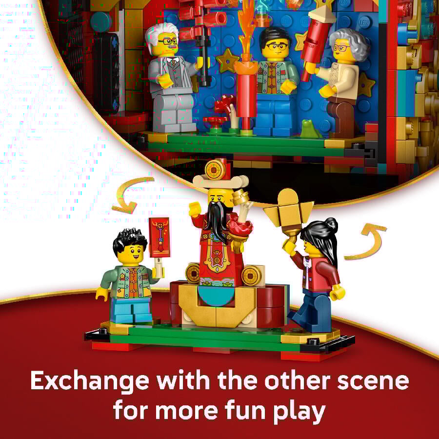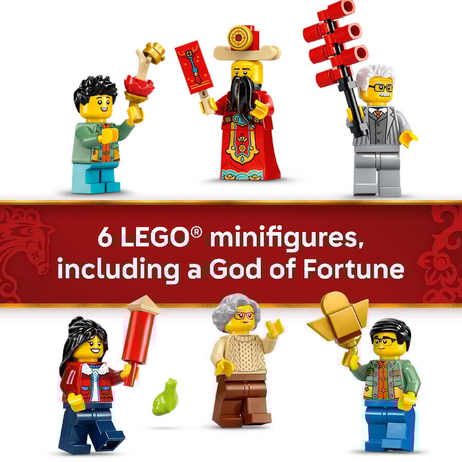 While one of the celebration scenes is displayed inside the firecracker model, the other can be played with separately. The set features 6 minifigures, including a God of Fortune, to encourage role play.